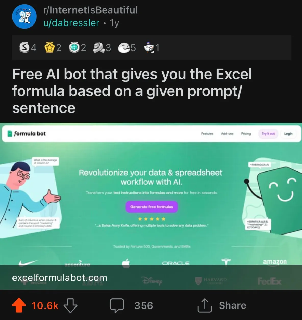 David wanted to validate his idea and get feedback from early users, so he posted about ExcelFormulaBot on an Excel subreddit. Surprisingly, it got a lot of attention with 10,000 upvotes. This convinced him to keep working on it. He started giving out the tool for free to see if people liked it and to get feedback.